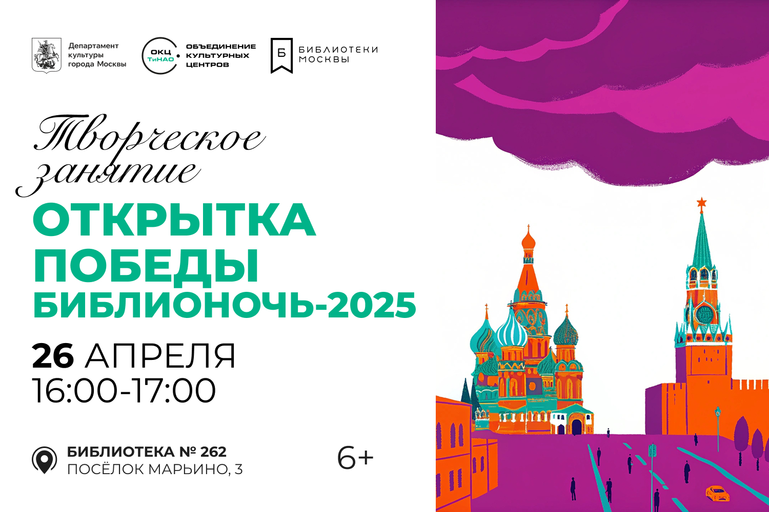 В честь празднования 80-летия Дня Победы в Великой Отечественной войне и в преддверии общегородской ежегодной акции «Библионочь» в библиотеке пройдет творческое занятие, где участники своими руками сделают поздравительную открытку, которую можно будет подарить в дни праздника и поздравить друг друга, как поздравляли ровно 80 лет назад. Украсят ее цветами и георгиевской лентой, а также словами «Победа!», от которых 80 лет назад ликовал и радовался народ в первый день, когда немецкие войска подписали пакт о капитуляции. Услышат, что дарили друг другу люди в этот день на улицах городов, увидят фотографии и рисунки народных гуляний в тот счастливый день. Прослушают знаменитые слова радиоведущего Юрия Левитана произнесенные 9 мая на Красной площади.